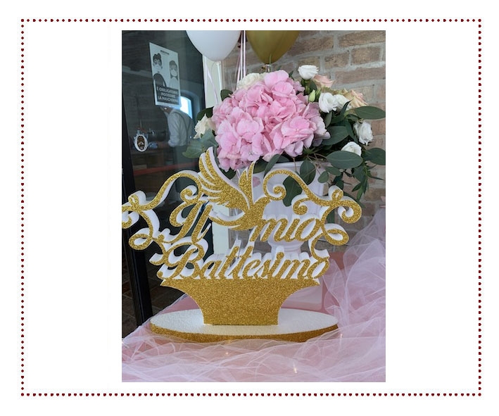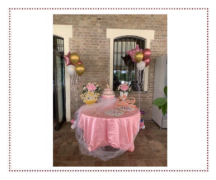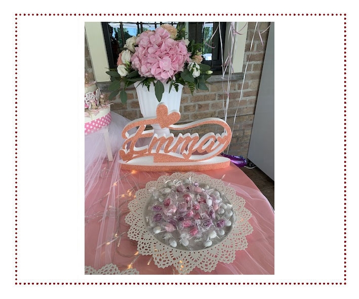 I genitori di Emma hanno scelto un battesimo in rosa e bianco, con palloncini colorati e tanti dolcissimi confetti.