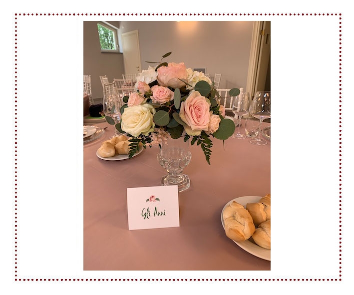 Marcello e Valentina hanno scelto come tema principale del loro matrimonio un tatuaggio che hanno entrambi e che li raffigura con i loro bimbi. Ho ripreso il tatuaggio e i colori, verde acqua e rosa fragola, per le grafiche, mentre la mise en place è stata realizzata tutta nei toni del rosa per dare un tocco elegante e romantico al pranzo, che si è tenuto alla Dimora del Tasso a Soragna.